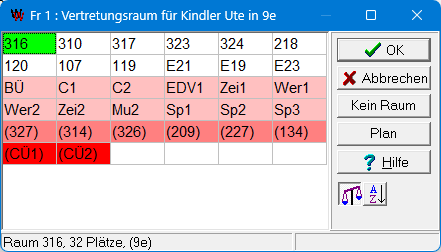 Die in Klammern gesetzte Räume sind zu klein. Die Statuszeile zeigt Informationen über den gerade ausgewählten Raum an. | ||||||